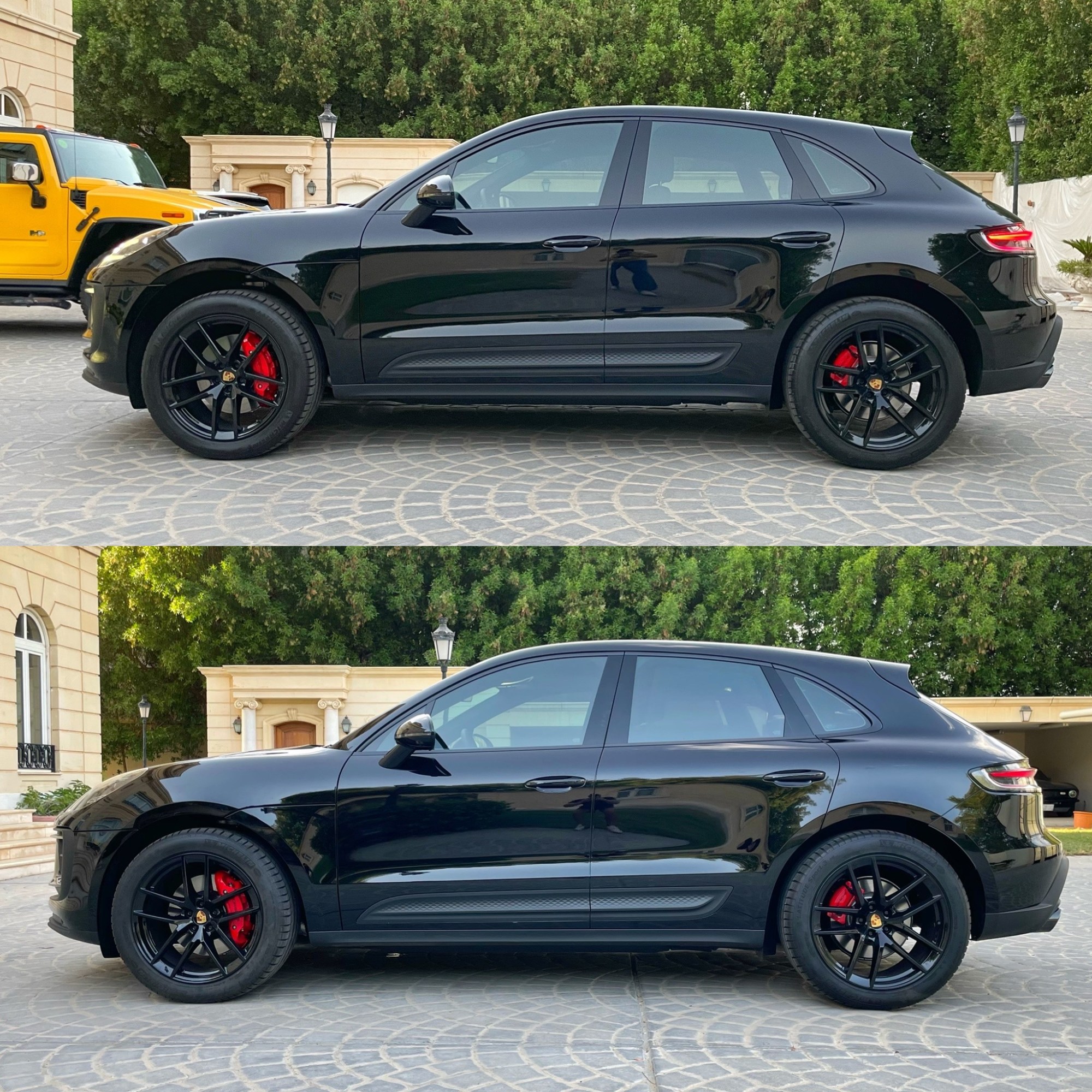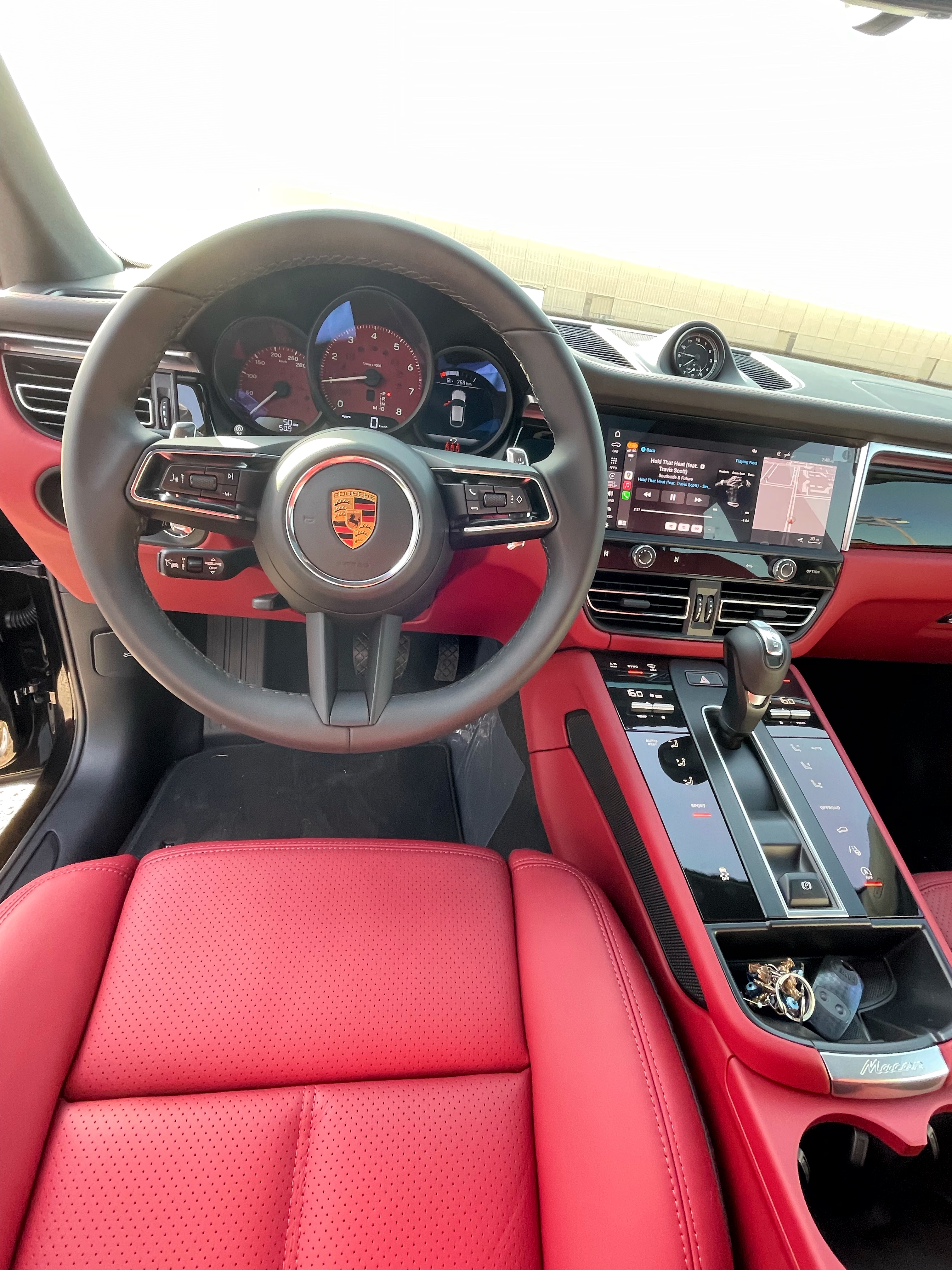My sisters car, but and spec’d to order by me…so shared? Black exterior with Burgundy Red interior, belts and speed gauge. Twin sport black tailpipes, and matt blacked out emblems. I chose the 20″ Macan S wheels in Vesuvius Gray, which looked very dark in the configurator. In reality, the wheels were much lighter and just looked wrong. Immediately, had them repainted to Gloss Black + the calipers in Gloss Red…because why not.